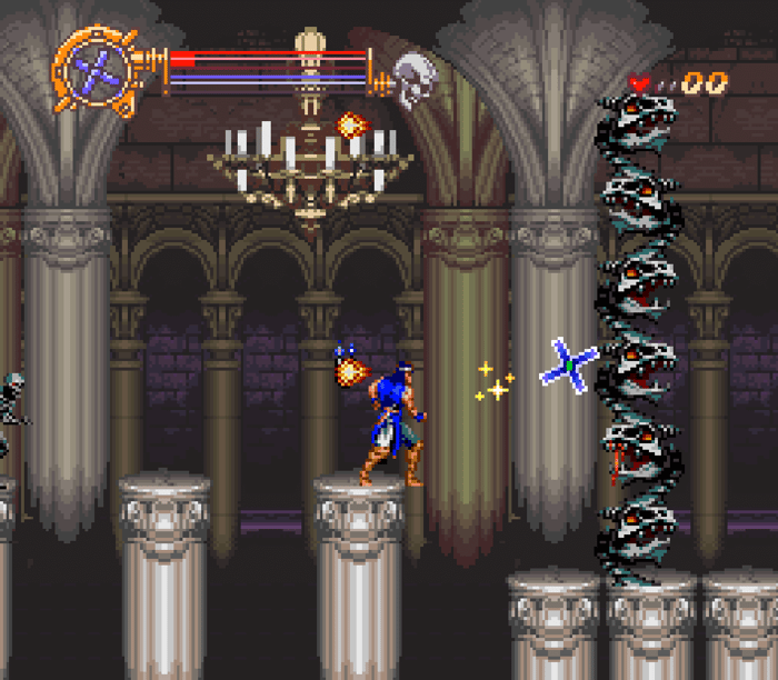 The reflection in Bloodlines is actually woven into the gameplay. This is kind of a silly example, but Bloodlines is a much more creative game in terms of its overall design. It’s also got a lot more gameplay variety and replayability thanks to the two characters. Richter is without a doubt a cooler character than John Morris or Eric Lacarde, but when comparing these two games, both John and Eric are way more fun to control than Richter. Righter’s movements in Dracula X are far too rigid, and I say this as a fan of classic Simon Belmont NES controls. He walks too dang slow, and the damage knockback is absurd. Meanwhile, even just comparing the whip wielders, John Morris can whip in multiple directions! Richter can do a fun little backflip, but his other cool moves like the slide and uppercut aren’t in Dracula X, so he doesnt’ get credit for them here. Then you add in Eric and his cool spear, and it’s over.