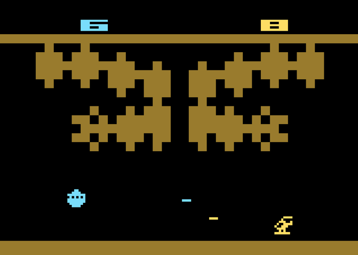 There are four types of ships that you can play as, each with their own attributes. The Ranger is a helicopter that fires fast, straight forward attacks that are limited by their short range. The Banshee is a jet fighter of sorts that shoots guided missiles. Similar to but not exactly how your shots tend to follow your own movements like in Combat or Megamania. The Specter is a flying saucer that shoots inverted neutron pulses that cross the screen in waves. And the Destroyer shoots torpedoes that travel erratically, widening their overall range at the cost of precision. Each of these ships is equally fun to play as and requires slightly different strategies to be proficient with. The wrinkle is, you don’t get to choose. Every round, you and your opponent fly a different ship at seemingly random. The rounds advance very quickly, too, which makes their intuitive controls especially appreciated.