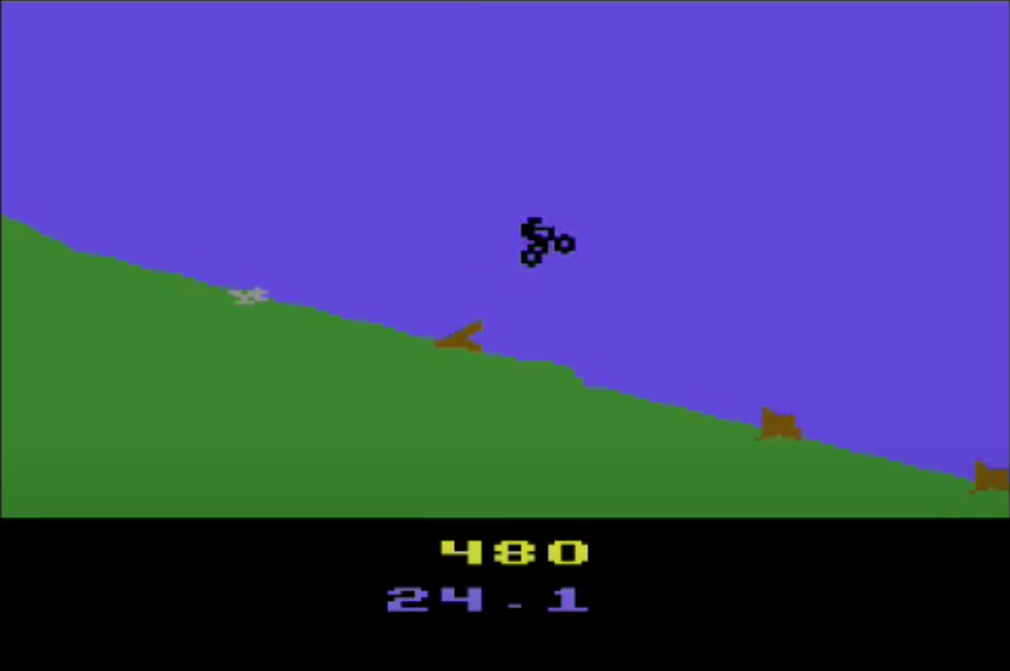 After skateboarding, you get Bicycling! This is absurdly fun. You play as an awesome solid black stick figure and you ride downhill doing stunts while trying not to fall off your bike. It’s fast, silly, and extremely fun. You control your speed by pressing forward or backward on the joystick, and you press the button to jump. While you’re airborne, different joystick directions will determine what type of stunt you do, but if the stunt animation isn’t completed by the time you land, you’ll fall on your butt and your stick figure will see stars. This was where I spent the majority of my playtime in California Games. It really is a ton of fun to play.