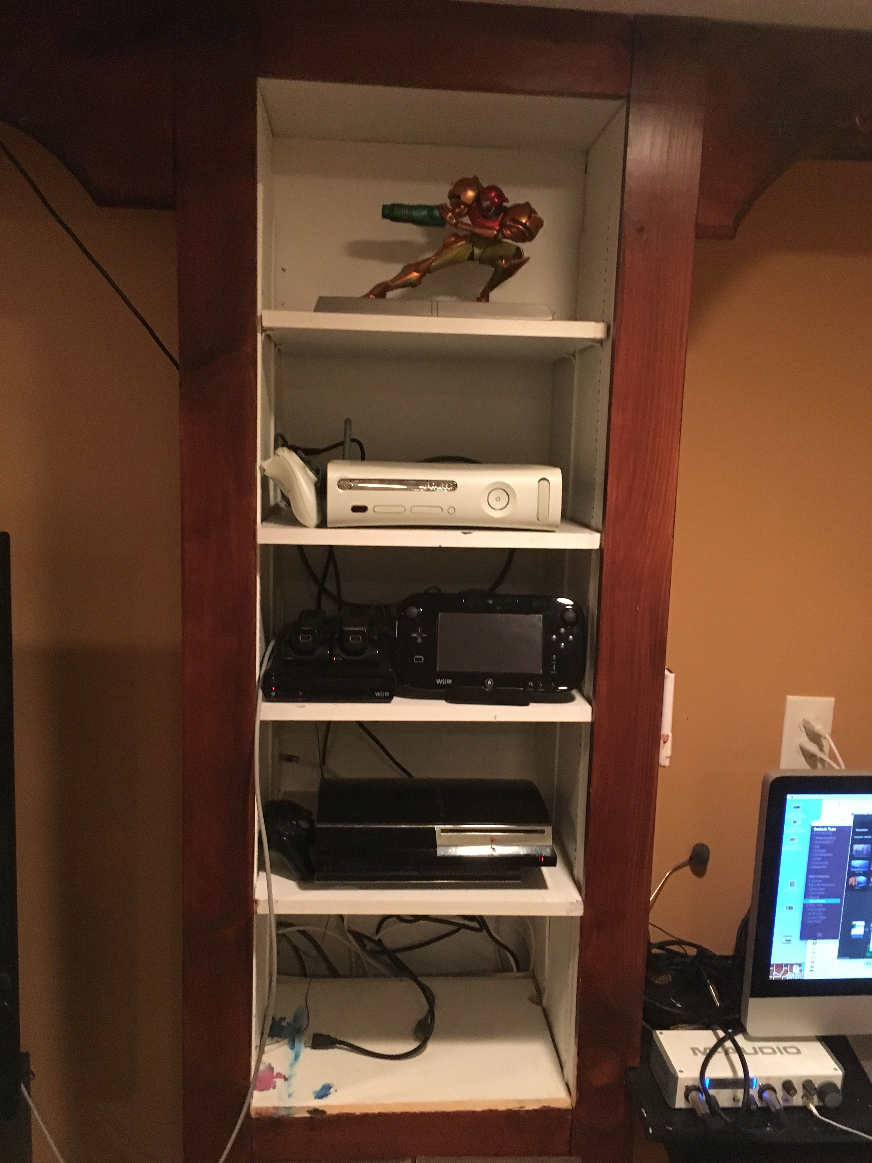 A few posts ago I think I mentioned that I hooked my Wii U up so I’d have access to the Virtual console, but I didn’t know how I was going to make it work on these shelves with the wires and all that. Well, I started digging into that issue first. I discovered that the previous tenants punched a hole into the side of this set of shelves, so I started trying to shove wires through it. The problem was that the hole wasn’t very big. The idea of expanding the hole occurred to me, but I’d like to avoid punching holes in the walls of my new house if I can, so I started seriously considering just putting the consoles on the shelves under the TV. That is, after all, what the shelves were designed for, right? The problem there is that, like I said earlier, the kids like to play down here, and as my son proved when he was a baby, small children like opening disk drives, and the Xbox 360 in particular would be in serious danger down there. Really, anything I put on those shelves could be in trouble with kids potentially trying to shove things into the disk drives. Fortunately, a solution presented itself.