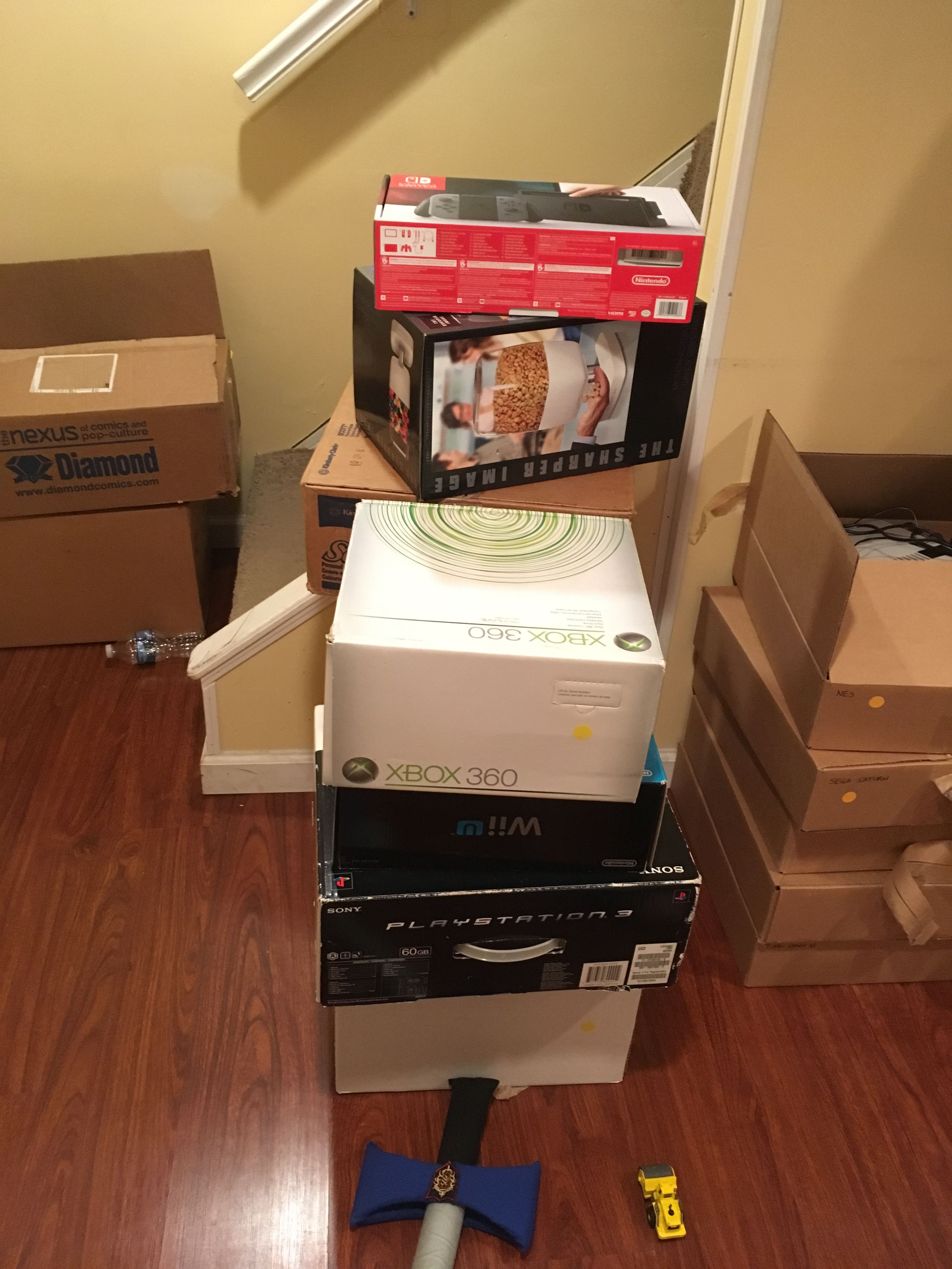 For the bottom shelf, I picked up a second Switch dock. That’s been great to be able to play it in multiple rooms, even if the price tag was a little steep. I’m not so sure about the order/placement of these consoles though. The whole thing is very functional, and the wires are in the back of the systems, but it could stand to be a little more clean/full. I’ll have to work on it a little more in the future, but the important part is that’s done. I’ll toss those system boxes into my “attic” pile and move on to the rest of my sorting.