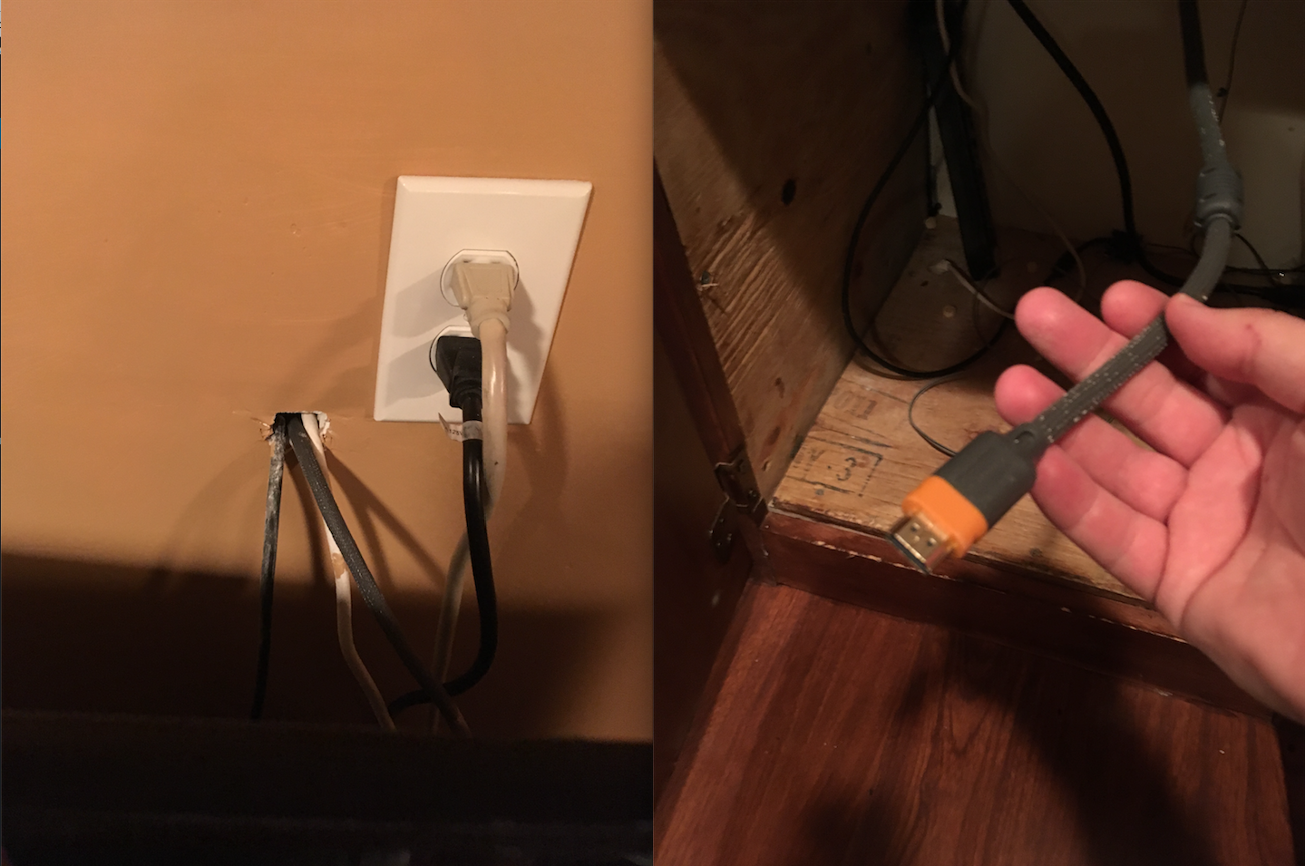 Left: Hole in the wall behind the TV. Right: The other end coming out of the cabinet under the shelves. What luck!